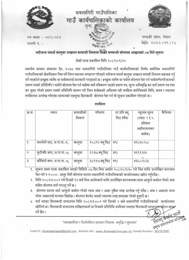 नदीजन्य पदार्थ बालुवा उत्खनन सामाग्री लिलाम बिक्री सम्बन्धी बोलपत्र आह्वानको ०७ दिने सूचना !!