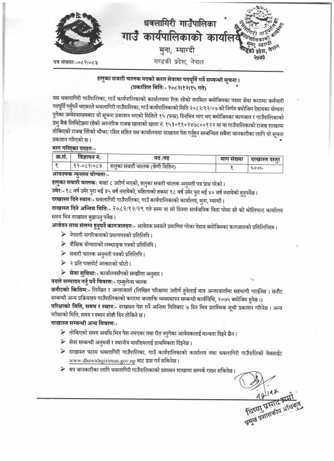 हलुका सवारी चालक पदको करार सेवामा पदपूर्ति गर्ने सम्बन्धी सूचना !!