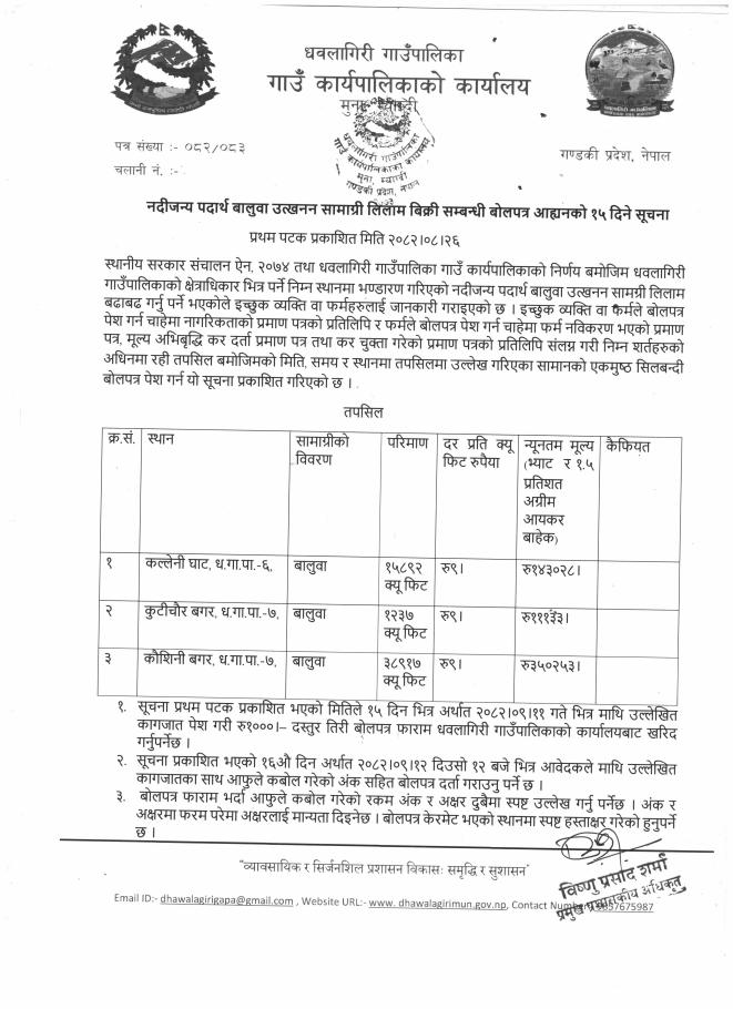 नदीजन्य पदार्थ बालुवा उत्खनन सामाग्री लिलाम बिक्री सम्बन्धी बोलपत्र आह्वानको १५ दिने सूचना (प्रथम पटक प्रकाशित मिति २०८२/०८/२६) !!