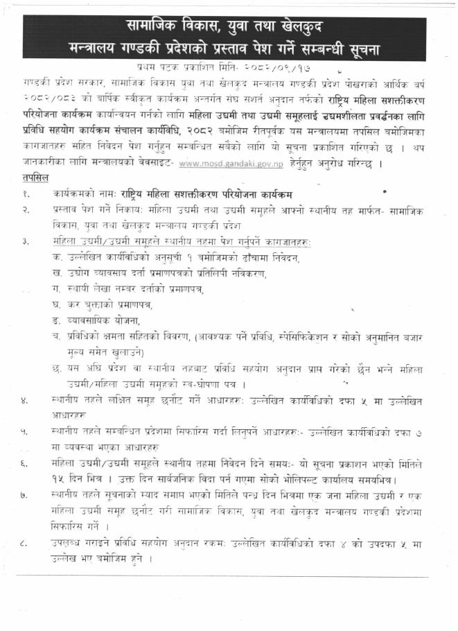 सामाजिक विकास, युवा तथा खेलकुद मन्त्रालय गण्डकी प्रदेशको प्रस्ताव पेश गर्ने सम्बन्धी सूचना !!