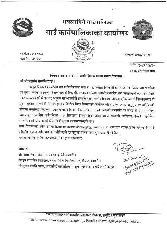 धवलागिरी गाउँपालिकाको शिक्षक व्यवस्थापन सम्बन्धी कार्यविधि,२०७६